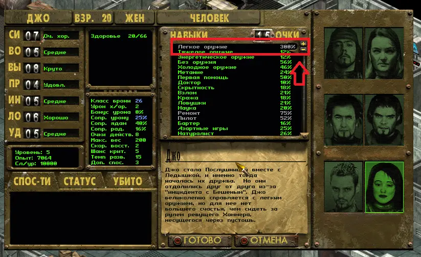 Here she is! Alive, without poisoning and with 20 hit points we write! Let's buff her small guns skill to 300!